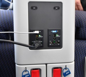 ANAのA320neo初号機のビジネスクラスに設けられた充電用USB端子(上段)と電源コンセント=17年2月17日 PHOTO: Tadayuki YOSHIKAWA/Aviation Wire