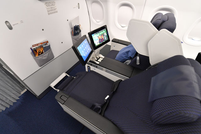 テーブルと個人用モニターを使用する状態にしたANAのA320neo初号機のビジネスクラス=17年2月17日 PHOTO: Tadayuki YOSHIKAWA/Aviation Wire