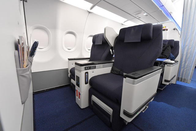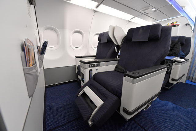 ANAのA320neo初号機のビジネスクラス=17年2月17日 PHOTO: Tadayuki YOSHIKAWA/Aviation Wire