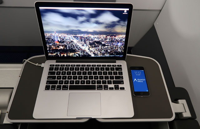 テーブルに13インチのMacBook ProとiPhoneを置いたANAのA320neo初号機のビジネスクラス=17年2月17日 PHOTO: Tadayuki YOSHIKAWA/Aviation Wire