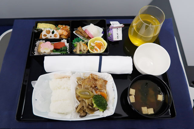 テーブルは大型のものを採用しているので、折りたたんだ状態でも使いやすい広さだ。広げた状態にすると、13インチのMacBook Proを置いても十分余裕があり、iPhoneなどを横に置いた状態で作業をしても問題はなかった。機内食では和食のメニューを選んだが、飲み物の置き場に困ることもなく、食事を済ますことができた。