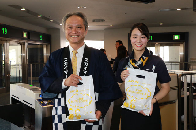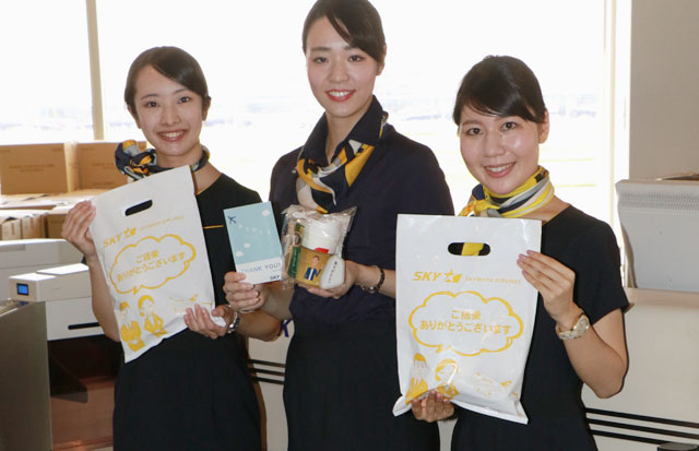 羽田空港で記念品を配ったスカイマークの地上係員=17年9月29日 PHOTO: Youichi KOKUBO/Aviation Wire