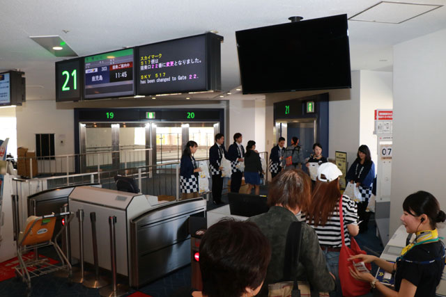 羽田空港の搭乗口で乗客に記念品を配るスカイマークの社員=17年9月29日 PHOTO: Youichi KOKUBO/Aviation Wire