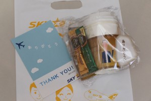 スカイマークが記念品として配ったインスタントコーヒーのセット=17年9月29日 PHOTO: Youichi KOKUBO/Aviation Wire