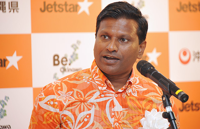 初便は往復ともに満席で「うれしい」と述べるジェットスター・アジア航空のパスパティCEO=17年11月17日 PHOTO: Yusuke KOHASE/Aviation Wire