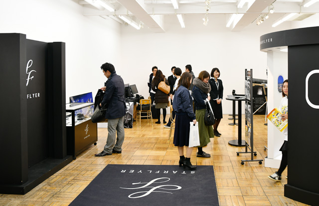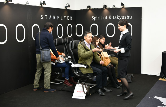 スターフライヤーのブースには、パソコンを使ったフライトシミュレーターが設置され、パイロットがエアバスA320型機の操縦特性などを来場者に説明していた。また、シートピッチの広さや電源コンセントを完備するなどを特徴とするレザーシートの体験コーナーを設け、機内で提供しているタリーズのホットコーヒーや、10月から搭載しているJAアオレン(青森県農村工業農業協同組合連合会)のリンゴジュース「希望の雫(しずく)」などを、客室乗務員がふるまった。