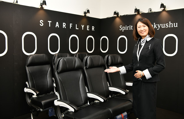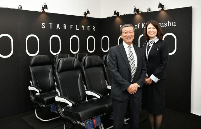 KitaQフェス in TOKYOのスターフライヤーブースに設けたシートの前に立つ松石社長(左)と客室乗務員=17年11月25日 PHOTO: Tadayuki YOSHIKAWA/Aviation Wire