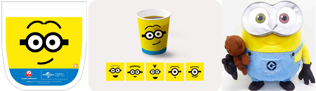 ミニオンジェット機内に設置する(左から)ヘッドレストカバー、紙コップ、ぬいぐるみ(JAL提供)