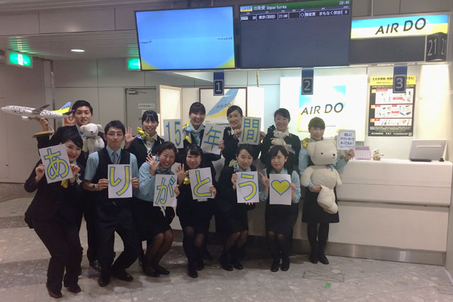 最終日を迎えたカウンターで記念写真に収まるエア・ドゥの係員(同社提供)