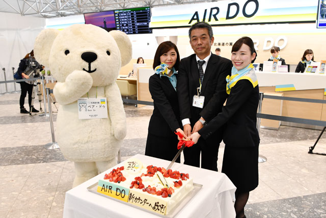 リニューアルオープンしたカウンター前でマスコットのベア・ドゥ(左)や地上係員とケーキに入刀するエア・ドゥの岡田浩千歳空港支店長(右から2人目)=18年1月17日 PHOTO: Tadayuki YOSHIKAWA/Aviation Wire