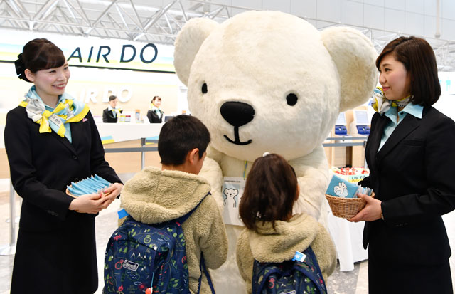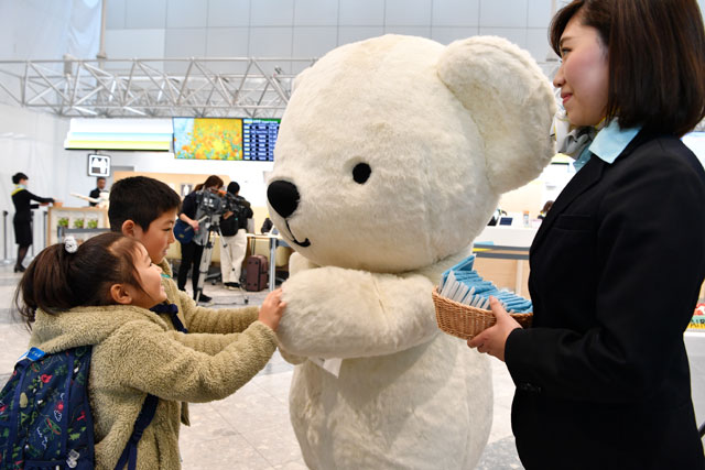 新千歳空港で子供たちに新カウンターオープンの記念品を手渡すベア・ドゥとエア・ドゥの地上係員=18年1月17日 PHOTO: Tadayuki YOSHIKAWA/Aviation Wire