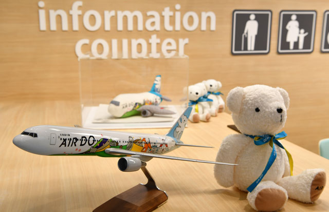 リニューアルした新千歳空港のエア・ドゥのカウンターに飾られたファンから贈られた機体やベア・ドゥのぬいぐるみ=18年1月17日 PHOTO: Tadayuki YOSHIKAWA/Aviation Wire