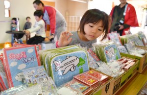 バザー会場の子供向けコーナーでJALグッズに興味を示す女の子=17年1月21日 PHOTO: Tadayuki YOSHIKAWA / Aviation Wire