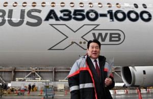 羽田でA350-1000飛行試験2号機の前に立つJALの植木社長=18年2月14日 PHOTO: Tadayuki YOSHIKAWA/Aviation Wire