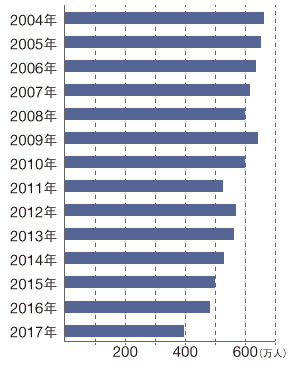 暦年の通過客は、成田空港が民営化した2004年が最も多く、664万4658人だった。2017年は2004年と比較し39.9%減となる399万3572人で、民営化以降で初めて400万人を下回った。