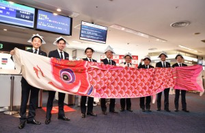 ・JAL、新制服初のこいのぼりフライト 客室乗務員も男性で(14年5月5日)
