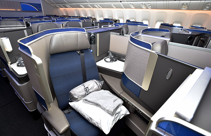 ユナイテッド航空の777-300ERのビジネスクラス「ユナイテッド・ポラリス」=18年4月24日 PHOTO: Yusuke KOHASE/Aviation Wire