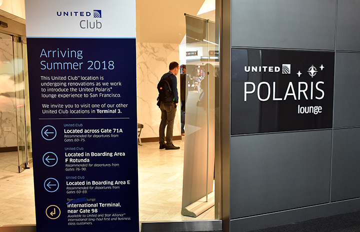 オープンを待つサンフランシスコ空港のラウンジ「ユナイテッド・ポラリス」=18年4月25日 PHOTO: Yusuke KOHASE/Aviation Wire