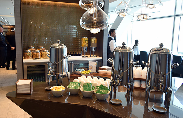 サンフランシスコ空港のラウンジ「ユナイテッド・ポラリス」のドリンクコーナー=18年4月25日 PHOTO: Yusuke KOHASE/Aviation Wire