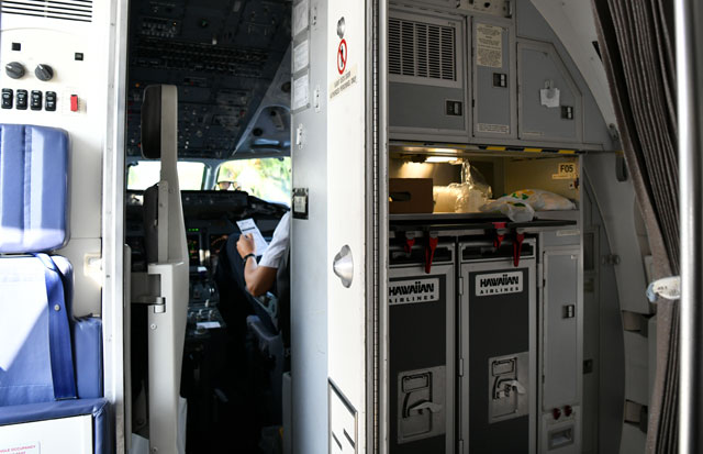 客室乗務員が飲み物を用意するホノルル行きHA207便のギャレー=PHOTO: Tadayuki YOSHIKAWA/Aviation Wire