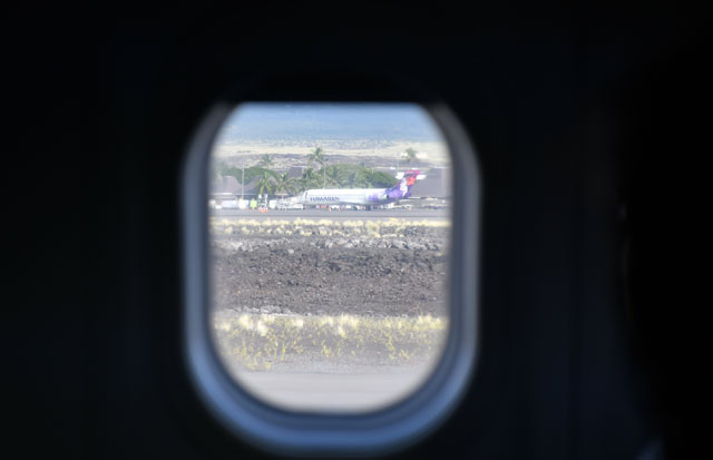 ラウンジで仕事を続けていると、搭乗時間になった。機材到着が遅れたため、出発も20分ほど遅れた。コナはPBB(搭乗橋)がないので、どの便も移動式スロープが機体に横付けされる。