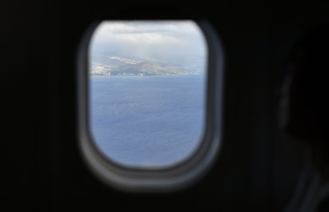 ビジネスクラスでは、出発前に客室乗務員が乗客に飲み物の希望を聞いて回っており、水平飛行に入ると注文した飲み物が提供された。エコノミークラスでは、カップに入ったミネラルウオーターを配っていたようだ。そして、離陸から30分で着陸態勢に入った。右側の窓を見ると、ダイヤモンドヘッドやワイキキの街並みが見えてきた。