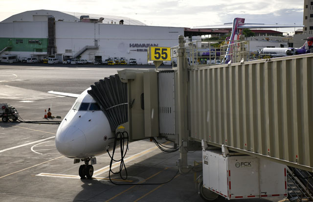ホノルルには午後4時ごろ到着。約50分の短いフライトを終え、PBBのあるスポットに入った。