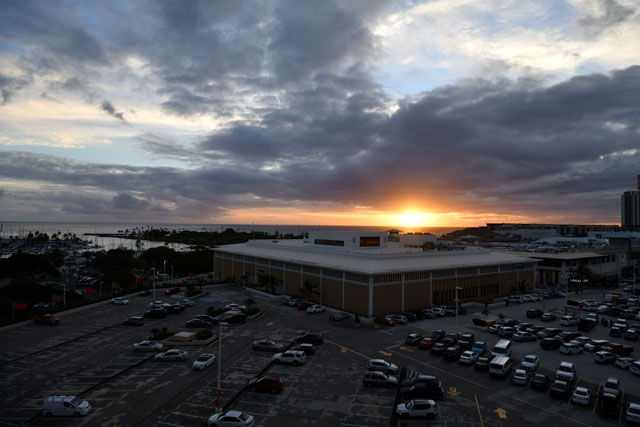 アラモアナホテルから見えた沈む夕日=PHOTO: Tadayuki YOSHIKAWA/Aviation Wire