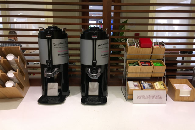 ハワイアン航空のラウンジ内にはコーヒーや紅茶、コーラをはじめとするソフトドリンクなどが用意されていた=PHOTO: Tadayuki YOSHIKAWA/Aviation Wire