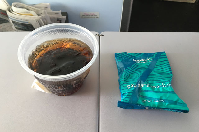ホノルル行きHA207便のビジネスクラスで提供されたコーラとスナック=PHOTO: Tadayuki YOSHIKAWA/Aviation Wire