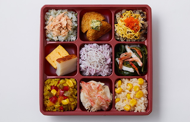 9マスに区切った弁当箱に、ご飯やおかずを詰め込んだ弁当「第4弾バニラエアの夏盛り弁当」は、ご飯を従来の3マスから5マスに増量。ボリュームアップを目指した。1000円。