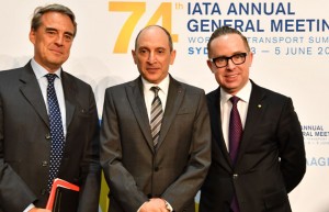 AGM閉会後に記念撮影に応じる(左から)IATAのジュニアック事務総長、カタール航空のバクルCEO、カンタス航空のジョイスCEO=18年6月5日 PHOTO: Tadayuki YOSHIKAWA/Aviation Wire