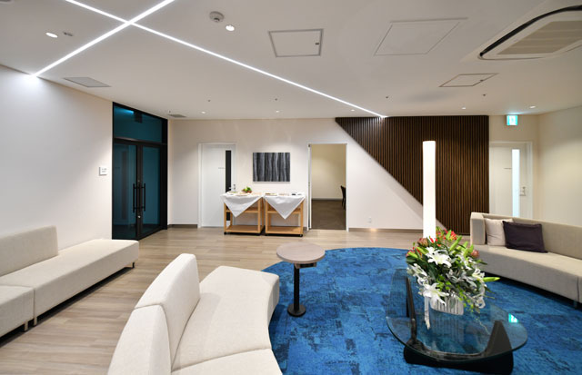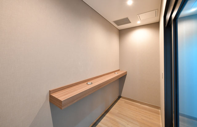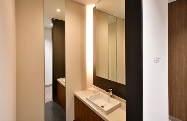 玉響は、LCCが乗り入れる第2ターミナル国内線エリアの一部に新設。面積は373.5平方メートルで、専用の出入口や受付、ソファやテーブルを置いた「スカイラウンジ」、6人が座れる会議室、化粧室、喫煙室を設けた。化粧室には、TOTO(5332)の最上級ウォシュレット付便器を設置し、パウダールームを併設した。