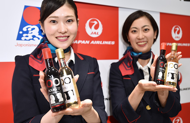オリジナルワイン「DOUBLE “O”」を手にするJALの客室乗務員=18年6月26日 PHOTO: Yusuke KOHASE/Aviation Wire