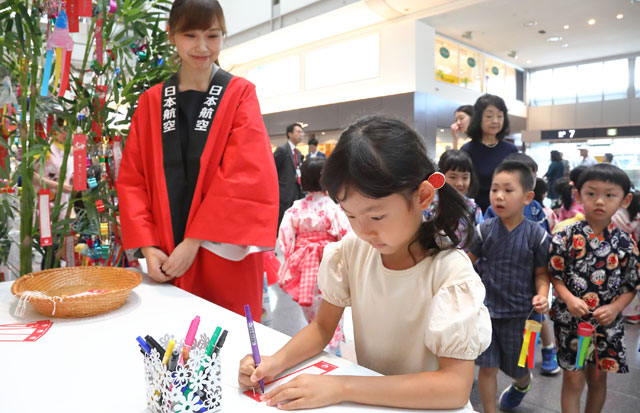 羽田空港に設置されたJALの笹竹に飾る短冊に七夕の願い事をしたためる女の子=18年7月6日 PHOTO: Masahiro SATO/Aviation Wire