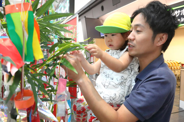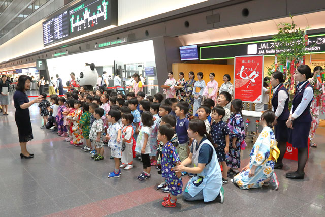 また、空港内にある保育園「アンジュ保育園」の園児が浴衣を着て訪れ、合唱を披露。「笹の葉さらさら」で始まる『たなばたさま』、『シャボン玉』などを歌い、利用客や園児の保護者とみられる人たちが聞き入っていた。