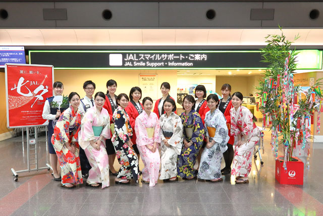 七夕を翌日に控えた7月6日、日本航空(JAL/JL、9201)は羽田空港第1ターミナルで七夕イベントを開催した。地上係員が浴衣を着用して出迎え、利用客が願いごとをしたためた短冊を、ターミナル内に設置された笹に飾り付けた。