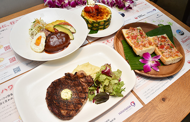 トミーバハマで提供する(左上から)アイランドロコモコ、パイナップルのクレームブリュレ、ロミロミサーモンのオープンサンド、リブアイステーキ=18年7月19日 PHOTO: Yusuke KOHASE/Aviation Wire