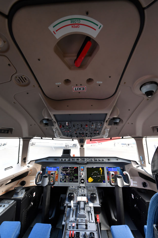 ファンボロー航空ショーで飛行展示を披露したMRJの飛行試験3号機のコックピット=18年7月17日 PHOTO: Tadayuki YOSHIKAWA/Aviation Wire