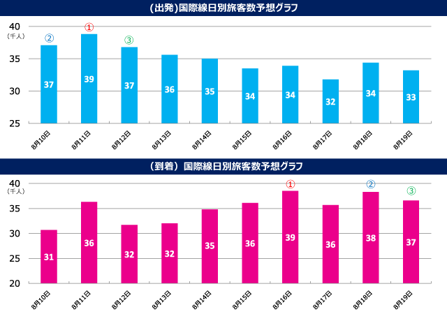 8月10日から19日までの日別旅客数予想グラフ(上段:出発、下段:到着、関西エアポートの資料から)
