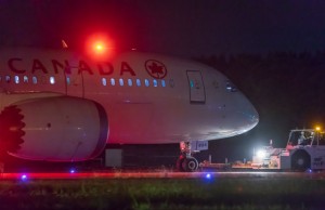 成田空港の未使用誘導路で立ち往生し駐機場へけん引されるエア・カナダのモントリオール発AC5便=18年7月30日20時33分ごろ PHOTO: Youichi KOKUBO/Aviation Wire