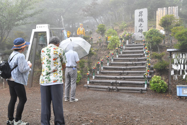 JALによると12日午後2時現在で、三十三回忌を迎えた昨年よりも13家族81人少ない79家族266人の遺族が、時折激しい雨が降る御巣鷹山を訪れた。これまでの同時刻の過去最多は2015年で、100家族387人だった。
