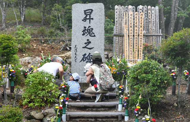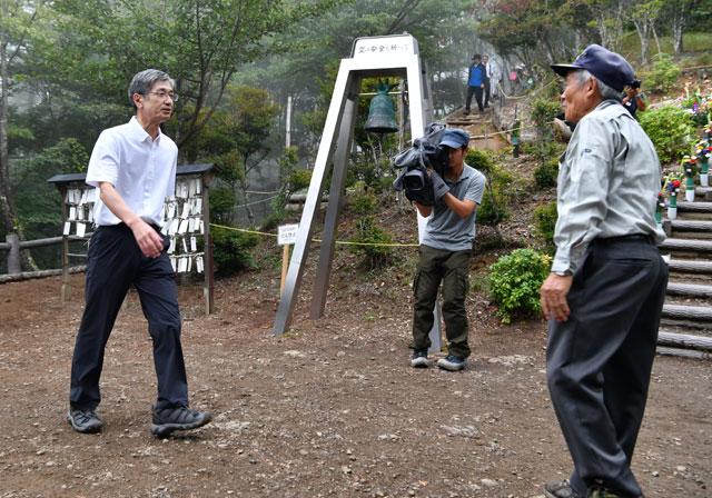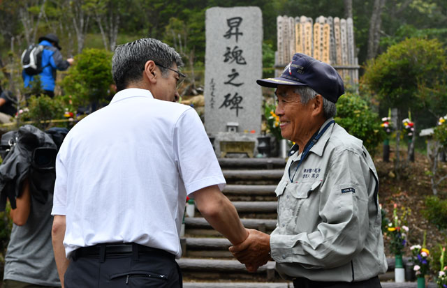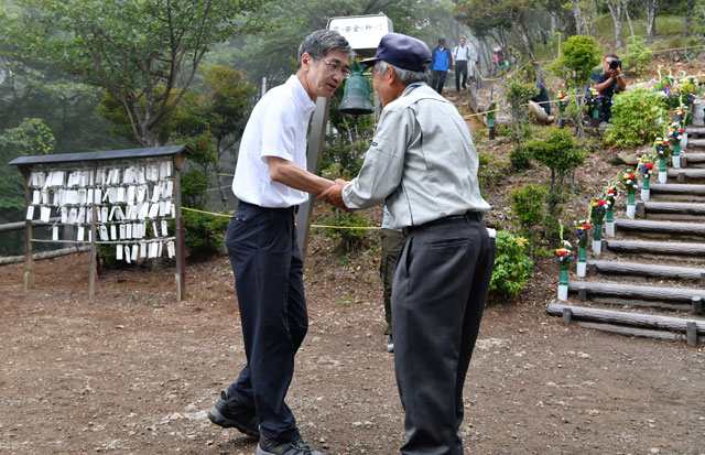 今年4月に、事故後入社の社員で初めて社長に就任したJALの赤坂祐二社長は午後1時21分すぎ、山頂付近にある「昇魂之碑」を訪れ、出迎えた御巣鷹山の2代目管理人、黒沢完一さんにあいさつして一緒に献花し、線香をたむけた。