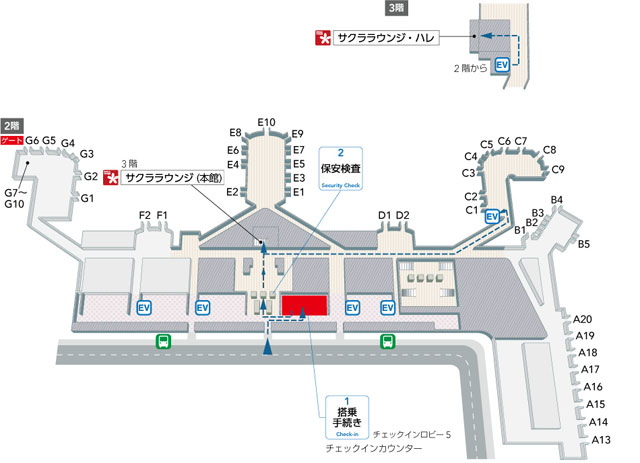 従来からあるサクララウンジの本館に加え、ターミナル3階に新ラウンジを開設。エントランス(玄関)のカウンターには溶岩石を用いてハワイらしさを表現し、ダイニングエリアはサーフアートで彩った。また、ラウンジには飛行機が見えるカウンター席を設けた。