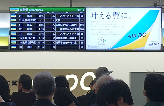 新千歳行きの欠航を知らせる羽田空港のエア・ドゥカウンター=18年9月6日 PHOTO: Tadayuki YOSHIKAWA/Aviation Wire