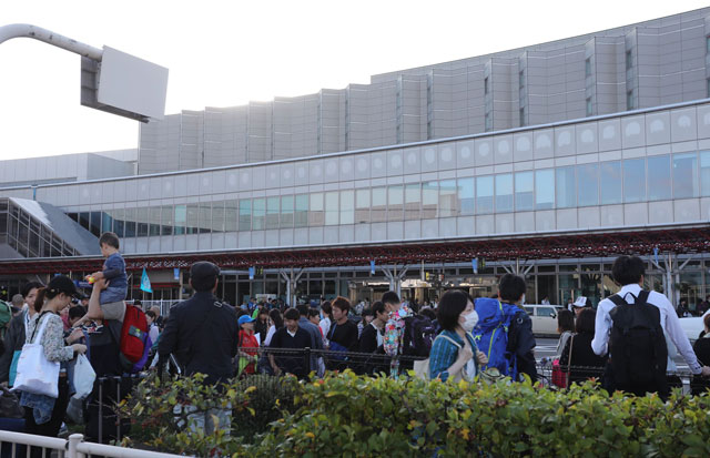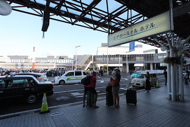震度6弱を記録した新千歳空港のターミナル外で待つ利用者ら=18年9月6日 PHOTO: Stringer/Aviation Wire