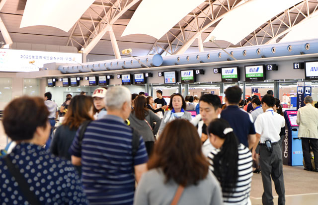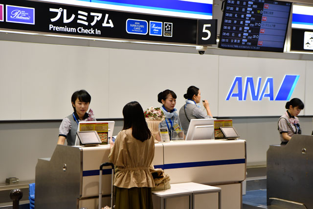 暫定運用が始まった関空第1ターミナルのANA国際線カウンターでチェックインする上海行きNH973便の乗客=18年9月14日 PHOTO: Tadayuki YOSHIKAWA/Aviation Wire
