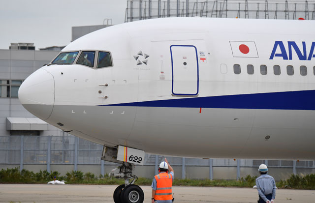 関空第1ターミナルから出発する国際線出発初便のANAの上海行きNH973便=18年9月14日 PHOTO: Tadayuki YOSHIKAWA/Aviation Wire