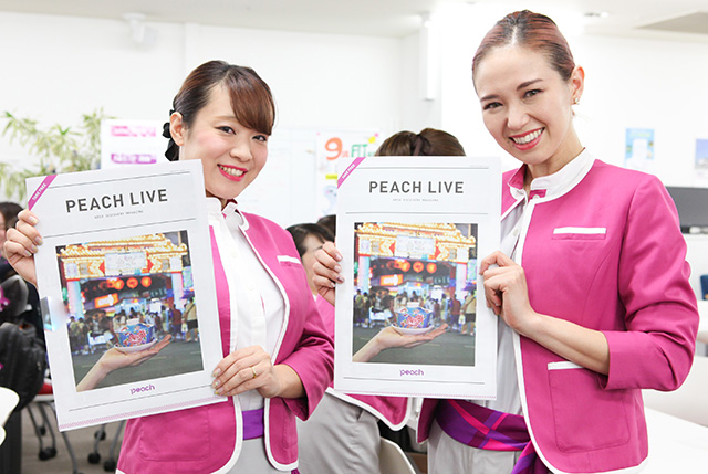 「PEACH LIVE」は、B4判(257ミリ×364ミリ)のタブロイド判に近い大きさの情報誌で、2016年7月から隔月で発行。国内就航地の空港のほか、客室乗務員が全路線の機内で配付する。就航エリアや周辺エリアの紹介のほか、地元の人々だけが知っているような「ディープな情報」を掲載している。