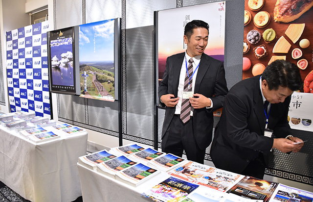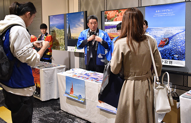 会場には札幌と稚内、紋別、函館、釧路、帯広の各市と中標津町がブースを出展。来場者に名産品やパンフレットを配布しピーアールを展開した。ブースは出展しなかったものの、旭川市も会に出席した。